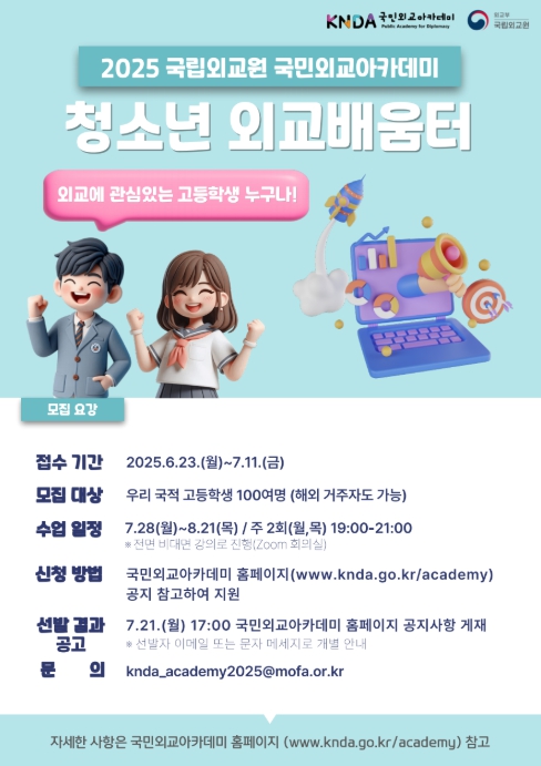 [뉴스서치] 외교부 국립외교원에서는 외교와 국제관계에 관심 있는 고등학생(우리 국적 해외체류자 포함)들을 대상으로 2025년 국민외교아카데미 '청소년 외교배움터 과정' 참가자를 6월 23일~7월 11일간 모집한다.
