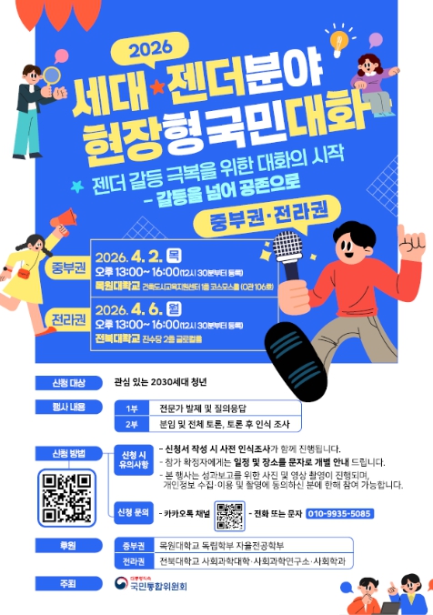 [뉴스서치] 대통령직속 국민통합위원회는 4월 2일 오후 1시에 대전 목원대학교에서, 4월 6일 오후 1시에는 전주 전북대학교에서 ‘세대·젠더분야 권역별 현장형 국민대화’를 개최한다고 밝혔다.