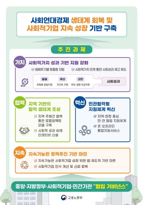 [뉴스서치] 고용노동부는 가치, 협력, 혁신, 지속가능성을 기본전략으로 제시하고 사회적기업 생태계 회복과 지속가능한 성장 기반 구축에 본격적으로 나선다.