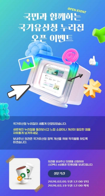 국가유산청은 3월 5일부터 19일까지 이번 누리집 개편 소식을 국민에게 알리고 이용을 활성화하기 위해 ‘소문내고 축하해’ 온라인 이벤트를 개최한다. 개편된 국가유산청 누리집 이용 소감을 남긴 국민 중 50명(우수 의견 10명, 추첨 40명)에게 모바일 선물 교환권을 증정한다. 당첨자는 3월 말 중으로 국가유산청 누리집 발표와 개별 알림을 통해 공지할 예정이다.
