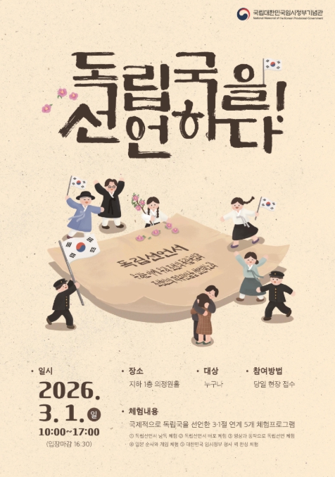 [뉴스서치] 국가보훈부는 제107주년 3·1절을 맞아 3·1운동에서 독립선언 과정을 체험할 수 있는 체험프로그램과 문화행사가 국립대한민국임시정부기념관(서울 서대문구)에서 다채롭게 펼쳐진다고 밝혔다.
