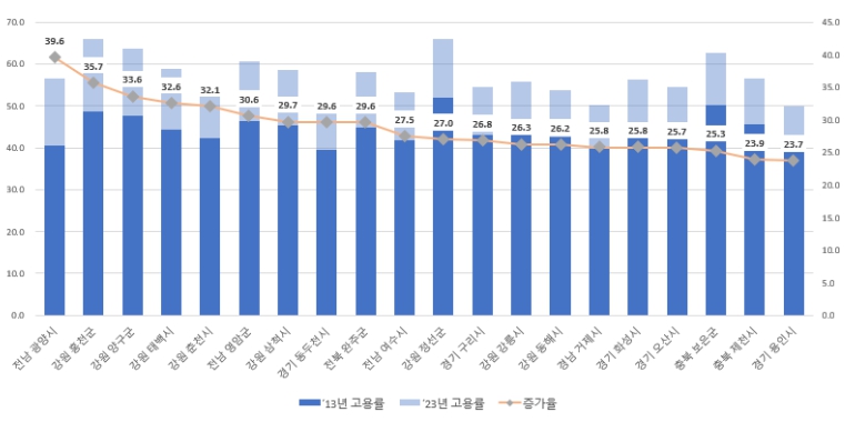 연구에 따르면 청년 취업자의 수도권-대도시 집중 추세가 더욱 뚜렷해진 반면, 인구소멸위험 지역의 청년층 취업자 감소가 두드러졌다. 조선업 밀집 지역을 포함한 영호남의 산업도시들도 청년고용률이 큰 폭으로 감소했다. 산업 도시들의 쇠퇴로 인해 기존에는 남성 중심의 고용구조를 갖고 있던 광양, 거제, 여수, 영암 등의 여성 고용률이 크게 증가한 점도 주목할 만한 변화다. 그 결과 수도권과 비수도권 간 상대임금 격차도 확대되어, 2013년에는 임금이 높은 상위 지역에 비수도권 산업도시들이 8곳이나 포함됐으나 2023년에는 6곳으로 감소했으며, 그나마 상위 10곳 이내에 세종시를 제외하고는 한 곳도 포함되지 않았다.