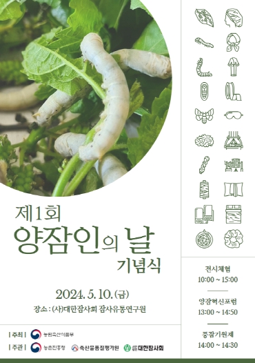 [뉴스서치] 농림축산식품부는 5월 10일 제1회 ‘양잠인의 날’ 기념행사를 잠사유통연구원(청주시)에서 개최하고, 기념식, 양잠혁신 심포지엄, 기능성 양잠제품 전시·체험, 풍잠기원제 등 다양한 행사를 진행한다고 밝혔다.
