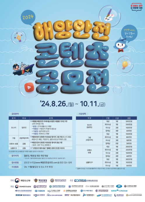 [뉴스서치] 해양수산부와 해양경찰청은 “해양안전문화 확산을 위해 '2024 해양안전 콘텐츠 공모전'을 8월 26일부터 10월 11일까지 개최한다.”라고 밝혔다.