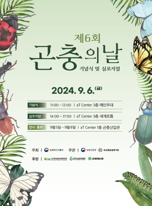[뉴스서치] 농림축산식품부는 제6회 ‘곤충의 날’ 기념식을 9월 6일 서울 에이티(aT)센터에서 개최하고, 부대행사로 곤충산업 육성 학술대회(심포지엄), 우수 곤충 제품 전시·홍보 및 시식·체험 등을 진행한다.