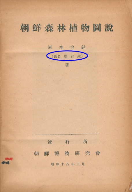▲ 조선산림식물도설(1943)의 표지. 저자는 Kawamoto, Taigen"(河本台璇)으로 기재되어 있으며 본명은 "郑台璇"(정태현)이라고 표기되어 있다. |