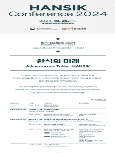 [뉴스서치] 농림축산식품부와 한식진흥원은 전 세계 케이(K)-푸드의 열풍을 지속하기 위하여 10월 25일 서울 성북동 삼청각에서 '2024 한식 컨퍼런스(HANSIK Conference 2024)'를 개최한다.