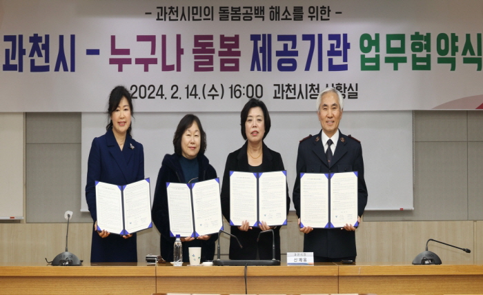 ▲ 과천시가 지난 2월 14일 누구나 돌봄 서비스 제공기관과 업무협약을 체결했다. 좌측부터 세번째 신계용 과천시장 |