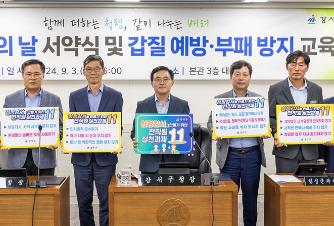 ▲ 진교훈 서울 강서구청장(가운데)이 구청 대회의실에서 열린 ‘전 직원 실천과제 11 서약식’에서 실천과제가 적힌 피켓을 들어보이고 있다. |