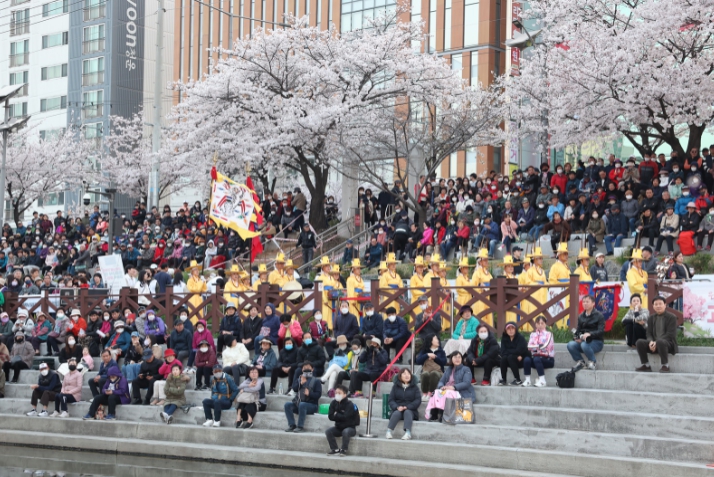 [뉴스서치] 5일 불광천에서 활짝 핀 벚꽃과 함께 ‘은평의 봄’ 벚꽃축제가 열렸다. 오후 6시 30분부터 처용무, 천고무 미디어아트, 국악인 남상일 공연 등 전통문화예술 공연이 펼쳐졌다.