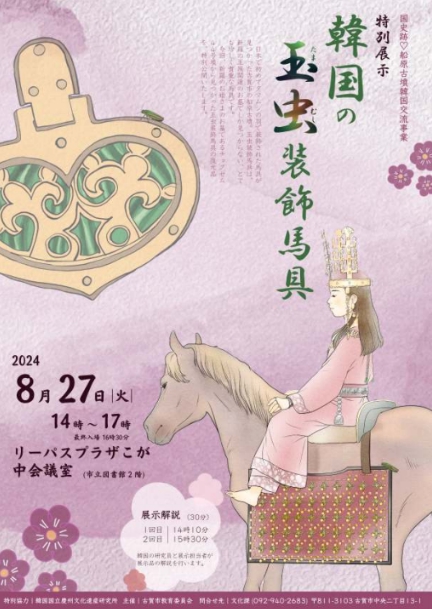 [뉴스서치] 국가유산청 국립문화유산연구원 국립경주문화유산연구소는 일본 고가시(古賀市) 교육위원회와 함께 8월 27일 오후 2시부터 5시까지 일본 고가시 평생학습센터 ‘리파스프라자코가(リーパスプラザこが)’ 2층 중회의실에서 ‘한국 비단벌레 장식 말갖춤(韓国の玉虫裝飾馬具)’이라는 주제로 특별전시와 연구성과 공개설명회를 개최한다.