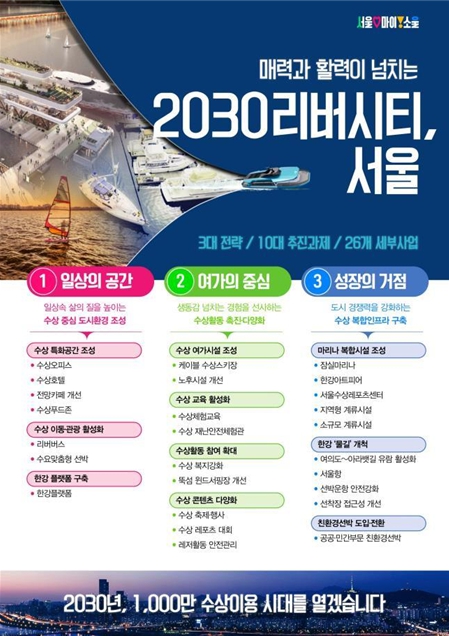 서울시가 2030년까지 1천만 명이 한강의 수상을 이용하는 시대를 연다. 한강으로 출근해 회사생활을 하는 것은 물론 크고 작은 선박이 이동하고 정박할 수 있도록 수상을 활성화한다. 바라보는 한강을 넘어 즐기고, 경험하고, 느끼는 한강을 만들어 매력과 활력이 넘치는 ‘리버시티 서울’을 조성한다는 목표다.