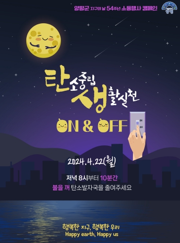 [뉴스서치] 양평군이 오는 22일 ‘제54회 지구의 날’을 맞아 오후 8시부터 10분간 군청사 등 관내 공공기관과 공동주택 등을 대상으로 소등행사를 갖는다고 밝혔다.