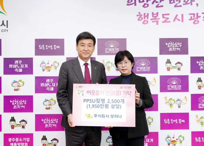 [뉴스서치] ㈜보라니 허명순 대표는 지난 12일 광주시청을 방문, 도움의 손길이 필요한 이웃을 위해 사용해 달라며 이웃돕기 현물로 PPSU 젖병 2천500개(1천950만원 상당)를 전달했다.