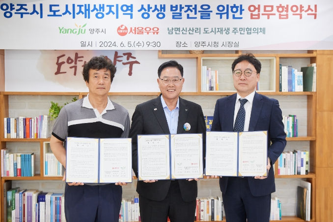 [뉴스서치] 양주시가 5일 오전 시청 시장실에서 남면신산리 도시재생주민협의체, 서울우유양주공장과 함께 남면신산리 도시재생사업의 성공적 추진과 지역 상생 발전을 위한 업무협약을 체결했다.