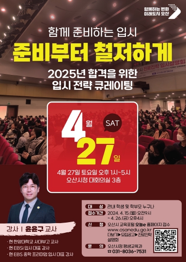 이번 설명회는 이달 27일 토요일 오산시청 대회의실에서 개최되며 EBS 입시 대표강사인 윤윤구 강사가 ▲입시 트렌드 ▲내년도 입시 전략 ▲의대 정원 확대에 따른 입시 변동 이슈 등 입시의 모든 것을 3시간 이상의 논스탑 강의로 진행할 예정이다.
