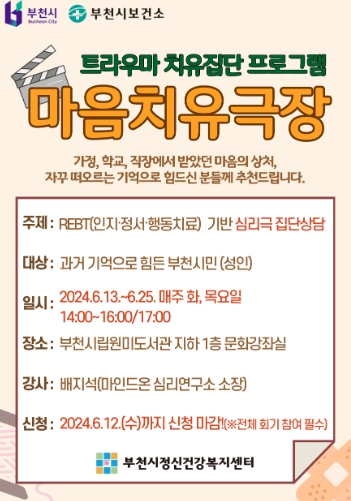 [뉴스서치] 부천시와 부천시정신건강복지센터는 오는 6월 13일부터 25일까지 트라우마로 힘든 부천시민을 대상으로 심리극 집단상담 ‘마음치유극장’을 운영한다.