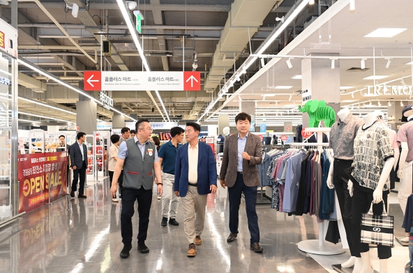 ▲ 김동근 시장이 6월 23일 의무휴업일 평일 전환 이후 처음으로 일요일에 정상영업하는 홈플러스 의정부점을 방문해 매장을 둘러보고 있다. |
