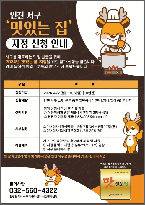 자세한 사항은 서구 홈페이지 ‘2024년 인천시 서구 맛있는 집 지정 신청업소 모집’ 공고문을 통해 확인하거나, 식품위생과 식생활개선팀으로 문의하면 된다.