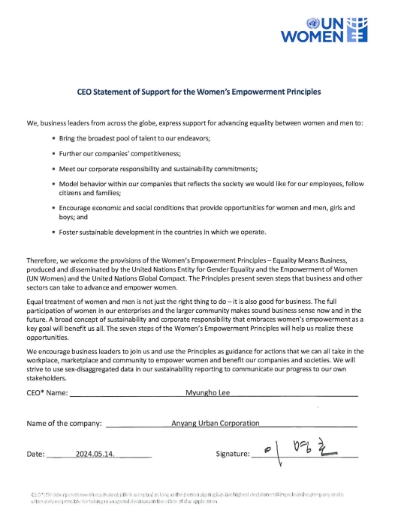 안양도시공사는 이번 가입을 통해 여성 인재 경쟁력 강화와 성평등 증진을 위한 노력을 국제적으로 인정받았으며, 앞으로도 공사의 경영 활동에 여성의 참여와 권리를 적극적으로 보장할 계획이라고 밝혔다.