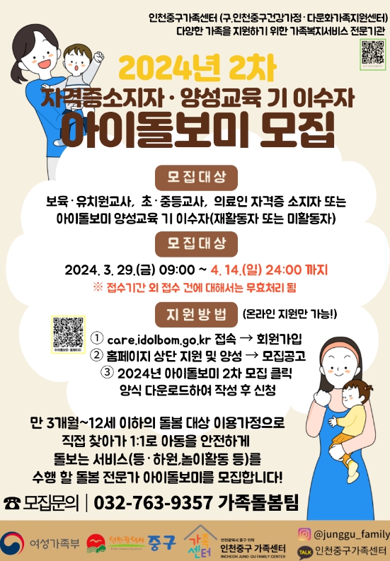 [뉴스서치] 인천시 중구(구청장 김정헌)는 중구가족센터(센터장 정광웅)에서 관내 자녀 양육 가정에 돌봄 서비스를 제공하기 위해 ‘2024년도 2차 아이돌보미 공개 모집’을 추진한다고 8일 밝혔다.