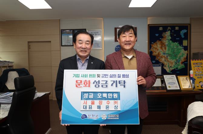 [뉴스서치] 광혜원면에 있는 서울장수㈜(대표 배윤상)는 27일 진천군청을 방문해 기업의 사회 환원 사업의 하나로 군민들의 문화생활을 지원하는 문화 성금 500만 원을 전달했다.