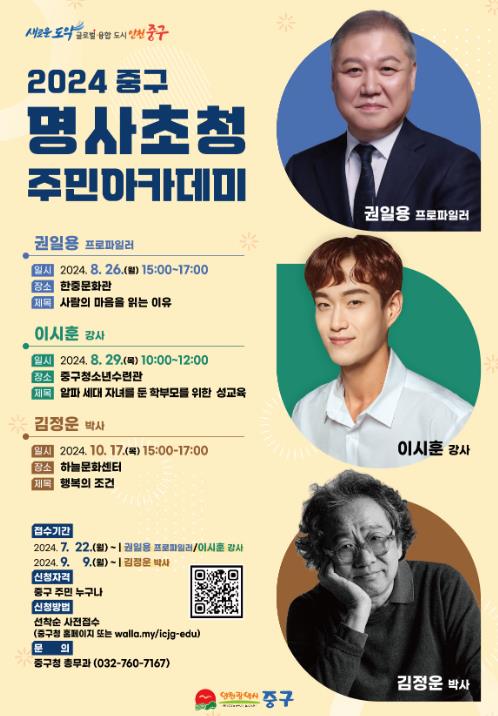 [뉴스서치] 인천시 중구는 오는 8월과 10월에 프로파일러 권일용 교수, 성교육 전문가 이시훈 강사, 문화심리학자 김정운 박사와 함께하는 명품 인문학 특강 ‘2024년 중구 명사초청 주민아카데미’를 개최한다고 10일 밝혔다.