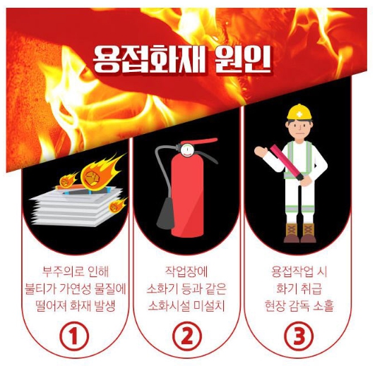 공사 현장 화재예방을 위해서는 ▲화재감시자 지정‧배치 ▲작업장 반경 5m 이내 소화기 비치 ▲용접‧용단 작업 시 주변 가연물 제거 ▲작업 후 잔여 불씨 확인 ▲안전모 및 내열성 보호장구 착용 등이다.