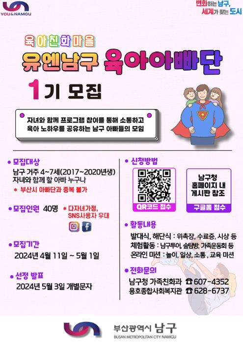 [뉴스서치] 부산광역시 남구는 아빠의 육아 참여 계기를 마련하고 함께 육아 문화 확산을 위한'유엔남구 육아아빠단'을 5월 1일까지 모집한다.