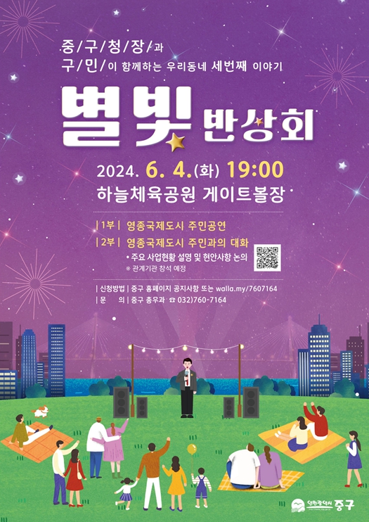 [뉴스서치] 인천시 중구는 오는 6월 4일 저녁 7시 영종국제도시 중산동 하늘체육공원 내 게이트볼장에서 올해 첫 번째 ‘별빛반상회’를 개최한다.