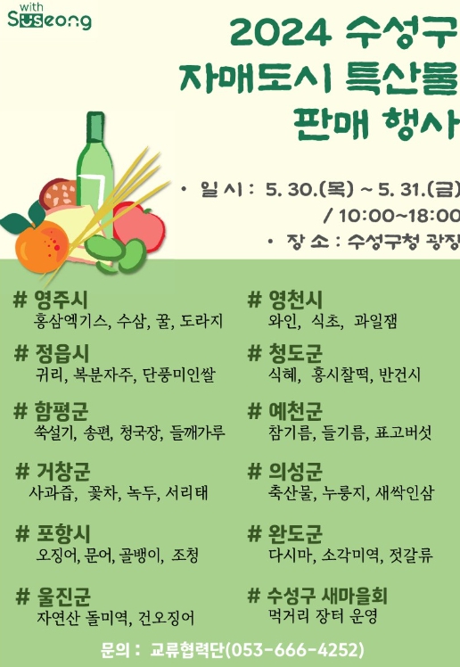 [뉴스서치] 대구 수성구는 오는 30일과 31일 이틀간 수성구청 광장에서‘2024 수성구 자매도시 특산물 판매행사’를 개최한다.