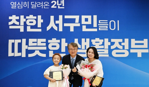 ▲ 광주 서구는 1일 김수현 어린이(사진 왼쪽)와 광주서구가족센터 원가빈씨(사진 오른쪽)에게 구정발전 유공 표창을 수여했다.