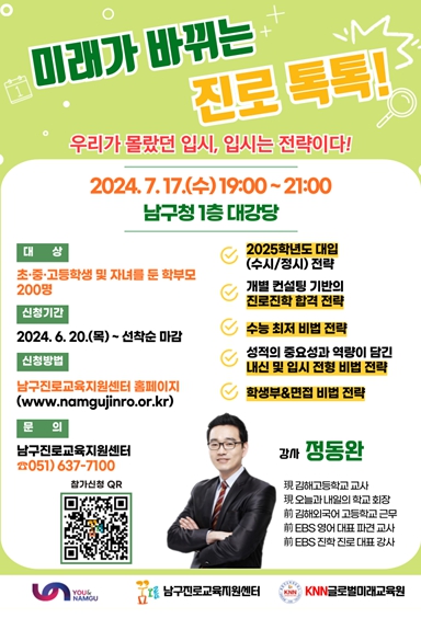 [뉴스서치] 부산 남구는 오는 7월 17일 오후 7시, 초·중·고등학생과 학부모 200명을 대상으로 남구청 대강당에서‘미래가 바뀌는 진로 톡톡! 우리가 몰랐던 입시, 입시는 전략이다!’라는 제목으로 진로·진학 토크콘서트를 개최한다.