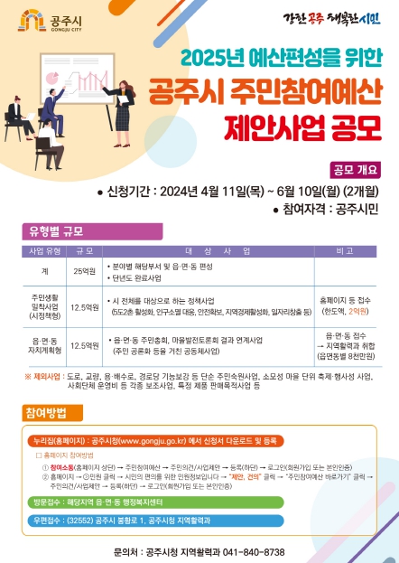 [뉴스서치] 공주시는 2025년 주민참여예산 편성을 위한 ‘주민참여예산 제안사업 공모’를 6월 10일까지 접수한다.