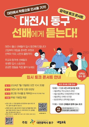 [뉴스서치] 대전 동구는 오는 13일 동구청 대강당에서 ‘대전시 동구 선배에게 듣는다’ 주제로 진로·진학 학부모 교육강좌를 개최한다.