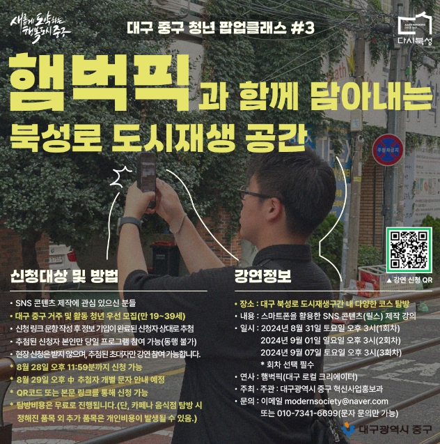 이번 체험은 인플루언서인 ‘햄벅픽’과 함께 편안한 분위기 속에서 북성로 도시재생 구간 내 다양한 공간을 탐방하면서 스마트폰을 활용해 누구나 쉽게 따라할 수 있는 영상(릴스) 편집·제작 방법 등을 공유하고 참가자가 업로드하는 방법까지 배우는 강의를 진행한다.
