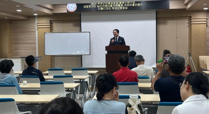 이날 강좌는 향수뜰농촌체험휴양마을에서 군북면 마을 이장과 마을 활성화에 관심 있는 주민 40여 명이 참석한 가운데, 마을디자인 평생교육원 박영선 원장의 ‘대청호기반 마을자원을 활용한 치유마을 디자인’이라는 주제로 진행됐다.