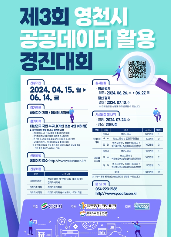 [뉴스서치] 영천시는 공공데이터 활용을 통한 아이디어 발굴과 데이터 시각화로 데이터 경제 활성화의 장을 마련하고자 오는 4월 15일부터 6월 14일까지 ‘2024년 제3회 영천시 공공데이터 활용 경진대회’를 개최한다.