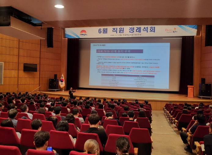 [뉴스서치] 김천시는 지난 3일 문화예술회관 대공연장에서 개최한 6월 정례석회에서 김충섭 시장을 포함한 소속 직원 450여 명을 대상으로 '직무상 갑질 금지 규정을 포함한 공무원 행동강령 교육'을 했다.