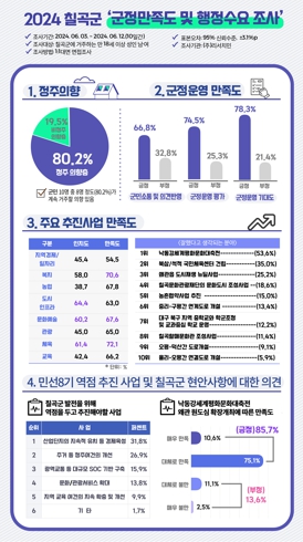 조사는 ‘정주의식’, ‘군정운영 전반에 대한 평가’, ‘군정시책 주요 분야별 만족도’, ‘개별사업에 대한 군민의견 조사’ 등 총 네 부분으로 진행됐다.