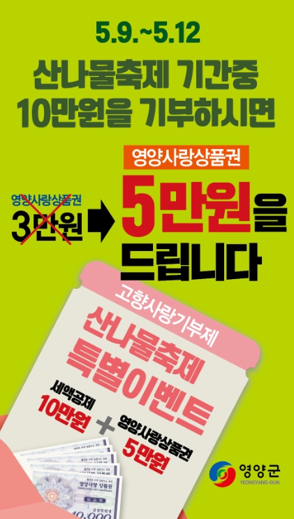 또한 『기부하고! 산나물 사러 가시더~』이벤트를 실시하여 10만 원 이상 기부하고 축제장 내 고향사랑부스에서 영양 응원멘트를 작성하는 기부자 100명에게 2만 원 상당의 영양사랑상품권을 추가 증정한다.