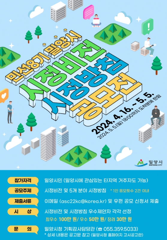 시정 비전은 민선 8기 밀양시가 추구하는 시민 중심의 내실 있는 행정, 주도적 특화 발전, 사회적 약자 배려, 인구 증가 및 지방소멸 대응 등을 주제로 밀양시가 나아갈 방향을 20자 이내로 담아내면 된다.