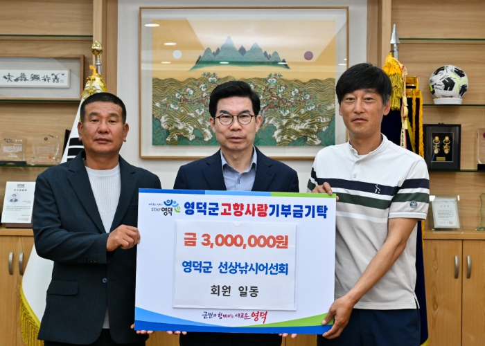 ▲ 영덕군 선상낚시어선회 김종배(왼쪽) 회장과 김태훈(오른쪽) 사무국장이 김광열(가운데) 영덕군수를 만나 고향사랑기부금을 전달하고 있다. |