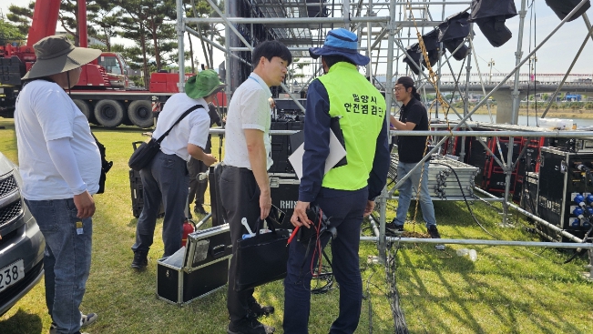 합동점검반은 지난 9일 밀양시 안전관리위원회에서 심의한 안전관리계획을 토대로 무대 및 가설건축물 등 시설물 구조의 안정성, 화기 관리상태 및 소화기 비치 여부, 전선 노출 및 접지 여부 등 전기관리 상태와 가스 안전 등 분야별로 꼼꼼하게 살펴봤다.