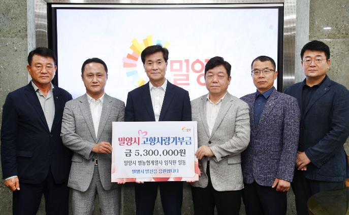 [뉴스서치] 밀양시는 범농협 계열사 임직원들이 지난 10일 시청 시장실을 방문해 고향사랑기부금 기탁을 했다고 밝혔다.