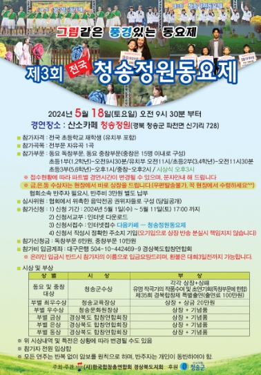 올해 3회를 맞는 동요제는 (사)한국합창총연합회 경상북도지회 주최·주관으로 ‘그림 같은 풍경 있는 동요제’라는 주제로 산소카페 청송정원을 무대로 펼쳐진다. 전국에서 독창 80여 명, 중창 10여 팀이 참가해 저마다 갈고 닦은 실력을 펼쳐 보였다.