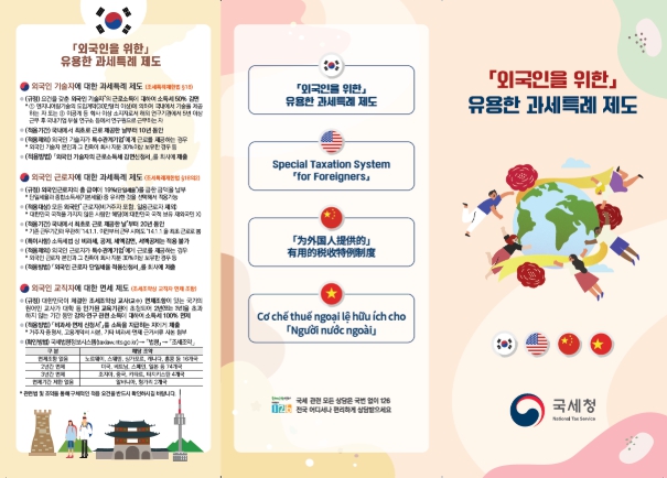 특히, 올해는 외국인만을 대상으로 적용되는 과세특례 제도의 주요 내용을 담은 리플릿을 4개 국어(한국어・영어・중국어・베트남어)로 제작하여, 각 세무서 민원실 및 대사관·외국인 근로자 지원센터 등 유관기관에 배포했다.