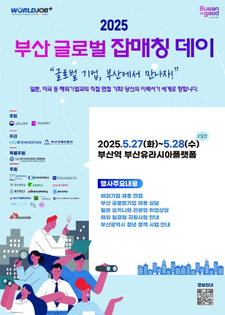 [뉴스서치] 고용노동부 한국산업인력공단은 5월 27일, 28일 양일간 부산유라시아플랫폼(부산 동구)에서 '2025 부산 글로벌 잡매칭 데이'를 개최한다.