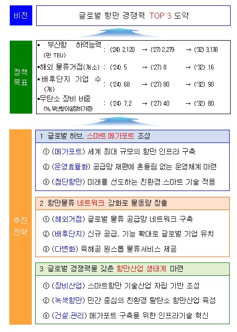 이에 정부는 글로벌 거점항만으로서의 부산항의 위상을 공고히하고 항만 경쟁력을 세계 TOP 3 수준으로 높이기 위하여 이번 방안을 마련하였다. 해양수산부는 부산항의 운영체계를 효율화하여 해운동맹 물량을 적기에 처리하도록 하고, 친환경‧스마트 전환을 가속화하여 국제규범을 선도하는 항만을 만들어 나갈 계획이다.
