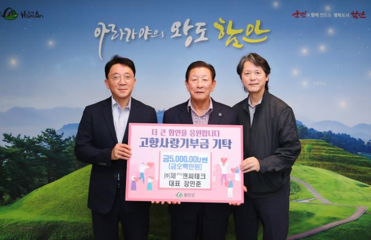 [뉴스서치] 함안군은 20일, 경북 김천 소재 ㈜제이앤씨테크 장민준 대표가 함안군에 고향사랑기부금 최고액인 500만 원을 기부했다고 밝혔다.
